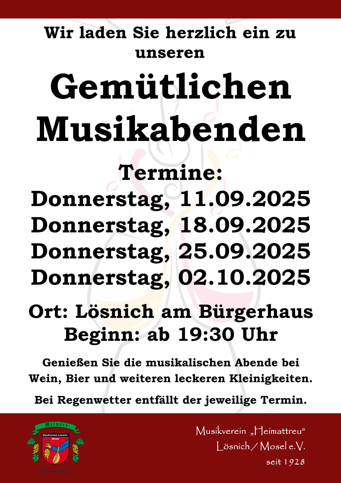 Vom 04.09. – 25.09 jeden Donnerstag ab 19.30 Uhr gemütlicher Musikabend mit dem MV Lösnich am Bürgerhaus.